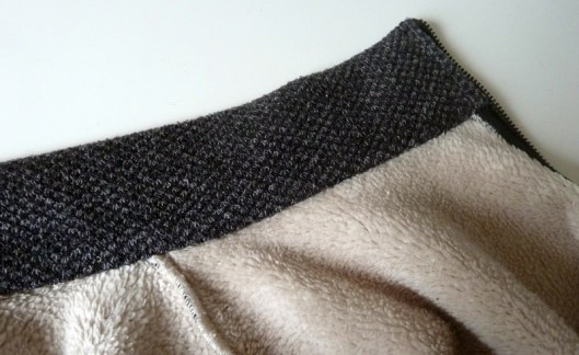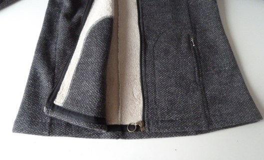 Bref… Une fois le zip des poches posé, j’ai tout simplement plaqué sur l’envers la pièce qui forme la poche (d’où la surpiqûre apparente sur l’endroit).