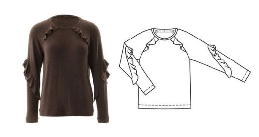Ci-dessous ma réalisation en taille 36 (patron proposé de la taille 36 à 44). Pour coudre ce t-shirt, je n’ai tout simplement pas cousu les volants au niveau de l’encolure, ni ceux des manches : la manche est ainsi en un seul morceau (il suffit de superposer la partie haute et la partie basse de la manche).