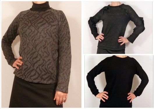 Le second, le t-shirt gris/noir, est le patron Burda n°111 du magazine de décembre 2017 que j’ai déjà cousu trois fois : un pull tout simple, un pull et ses petits volants et un sweat. Une valeur sûre donc ! Il ne me manquait plus que le t-shirt !