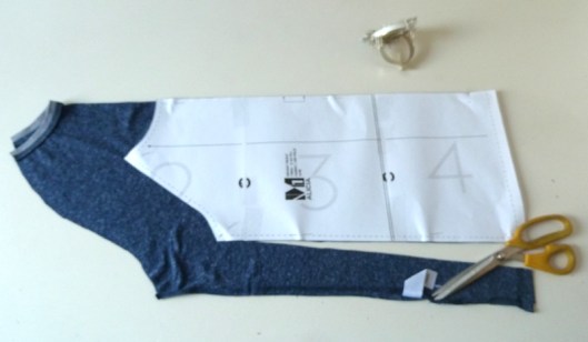 Pour savoir comment coudre un patron dans un t-shirt/sweat du commerce, je vous invite à lire l’article qui en parle ici… Ci-dessous, mon t-shirt en pleine phase de découpe !