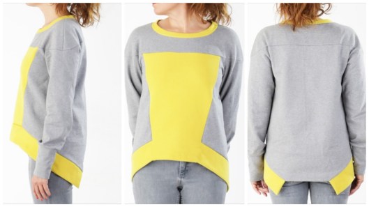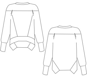 Il s’agit d’un sweatshirt de style casual avec un empiècement devant & dos qui emboîtent les épaules. Au devant, des découpes diagonales et au dos, des bandes d’ourlets originales. De profil, on remarque que la coupe est asymétrique avec un dos plus long que le devant.