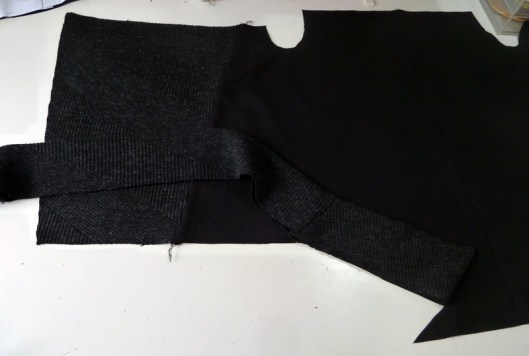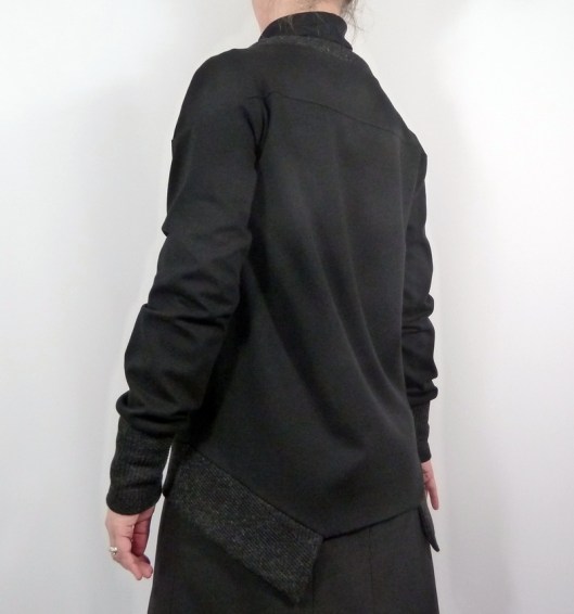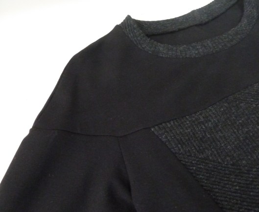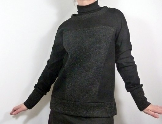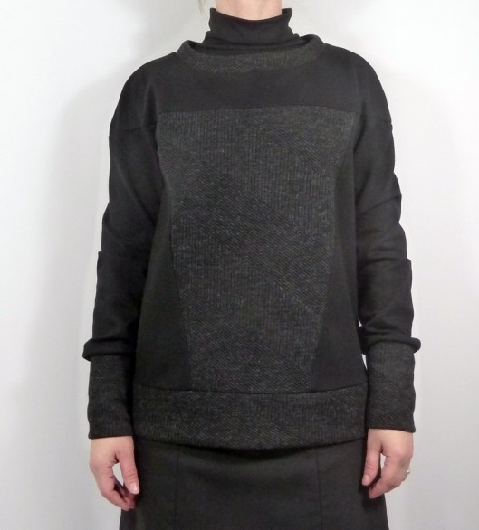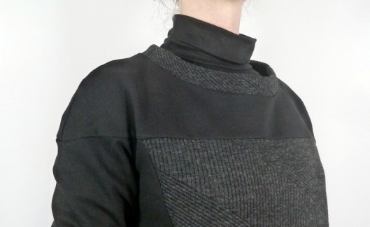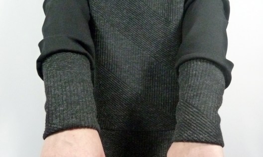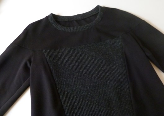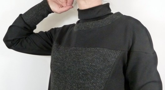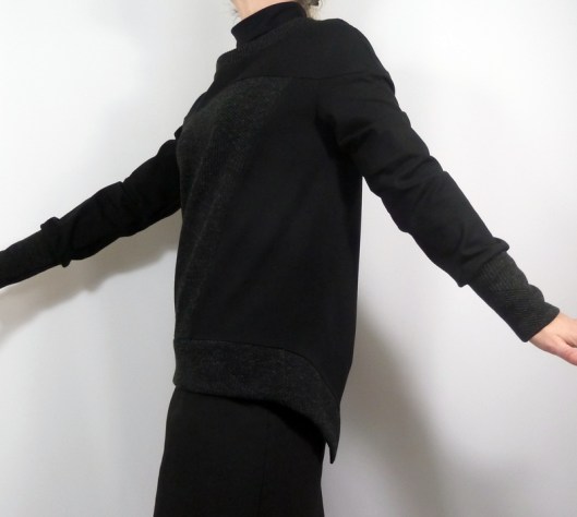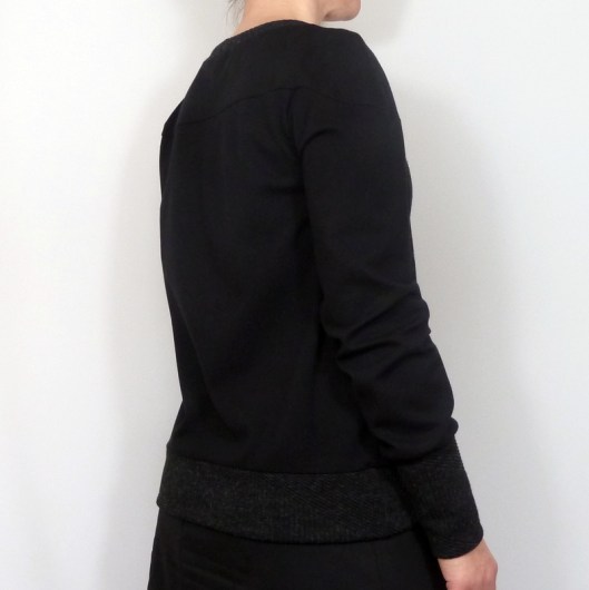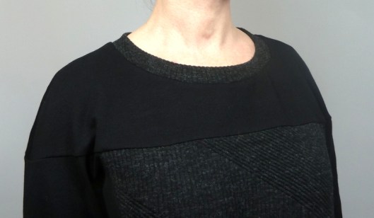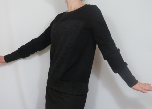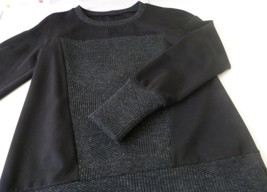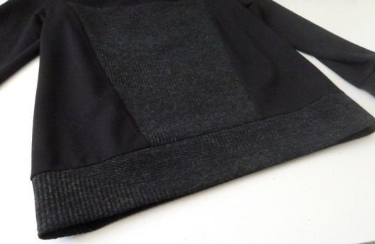 Ce sweat a été réalisé dans mes chutes de tissus : du jersey milano noir utilisé pour mon gilet Burda et du jersey texturé gris utilisé pour mon pull Burda…