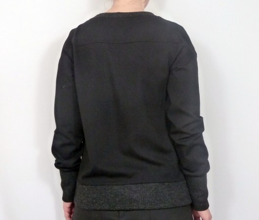 Au final, je ne pensais pas que ce sweat allait tomber si bas au dos et clairement cette coupe est peu flatteuse pour ma morphologie. Du fait de ma cambrure et de mon écart important entre taille et bassin, se créent des plis disgracieux au bas du dos. Et puis ces bandes d’ourlet, que je trouvais originales au début, finissent finalement par me déplaire…