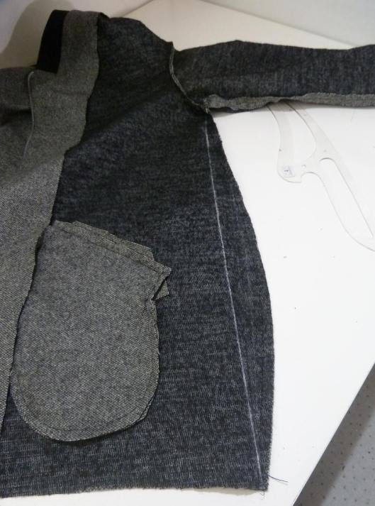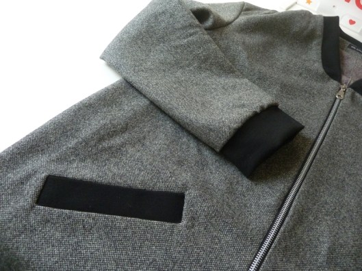 Le patron ne prévoit pas de poches extérieures et je trouve ça un peu dommage. J’en ai donc rajouté en cousant des poches passepoilées. J’ai utilisé le même jersey que celui du col et des poignets. La seule chose, c’est que j’ai préféré l’entoiler pour éviter qu’il ne se déforme à l’usage.