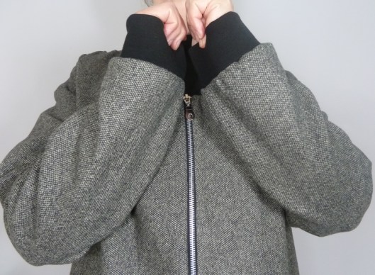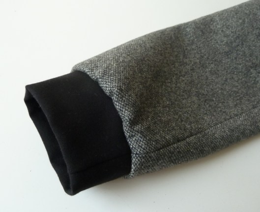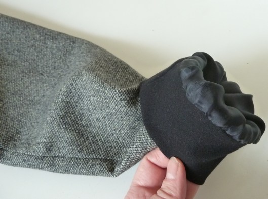 Pour le bas des manches, la finition proposée est celle du bord-côte. Le cahier technique propose deux façons de faire. J’ai opté pour la plus soignée des deux : les poignets sont donc pris en sandwich entre le tissu extérieur et la doublure :