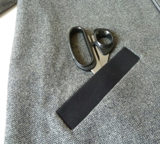 Perso, j’ai assemblé cette bande pliée en deux alors que le cahier technique préconise de la coudre dépliée. Ma bande est ainsi prise en sandwich entre le tissu extérieur et la parementure : elle est bien fixée et ne nécessite ainsi pas de glaçage.