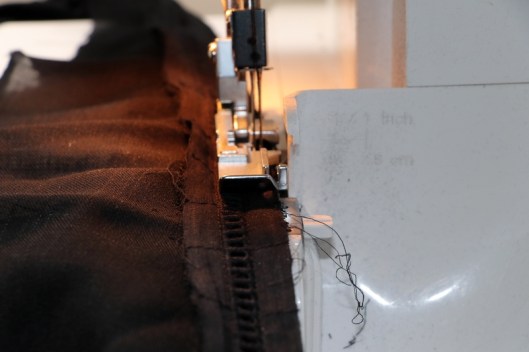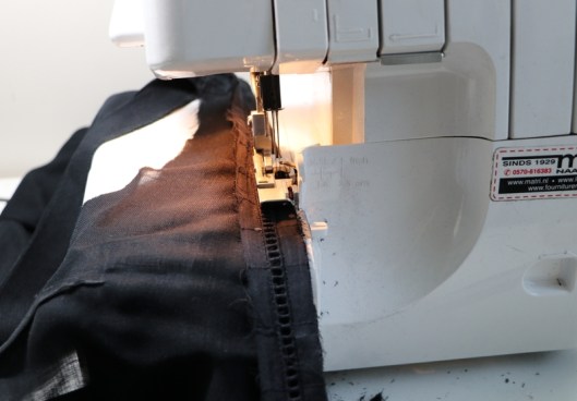 Pour l’ourlet du bas j’ai réalisé un simple ourlet surjeté que j’ai ensuite surpiqué.