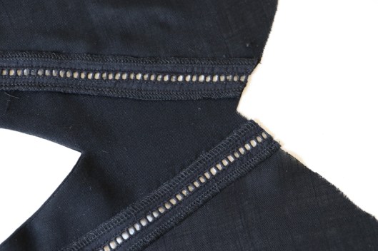 Comme vous pouvez le remarquer, j’ai cousu mon ruban d’un seul tenant entre le devant et le dos, histoire d’éviter d’avoir une couture au niveau des épaules. C’est d’ailleurs ce que la créatrice propose dans ses explications.