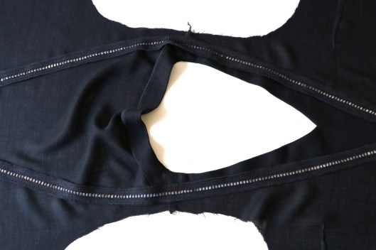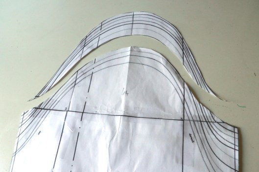 3/ Plutôt que de poser un biais en guise de finition pour l’encolure devant et dos, j’ai préféré doubler la pièce devant du corsage et j’ai opté pour une parementure pour le dos.