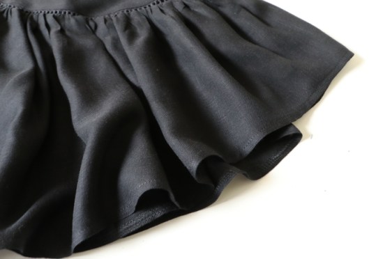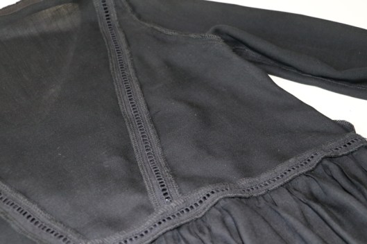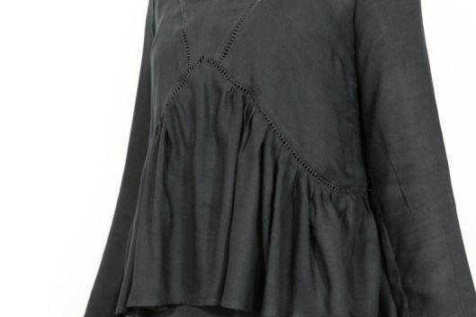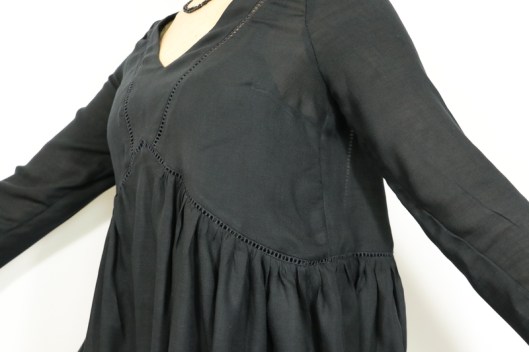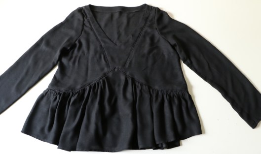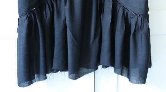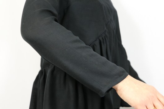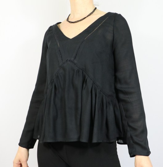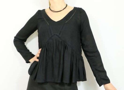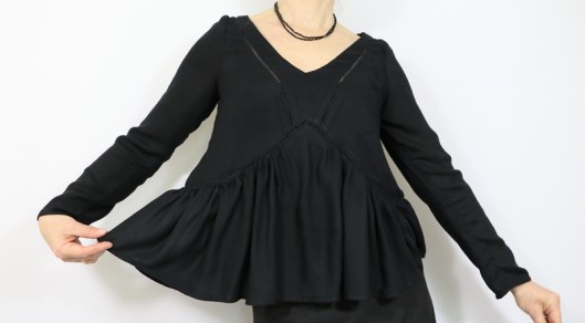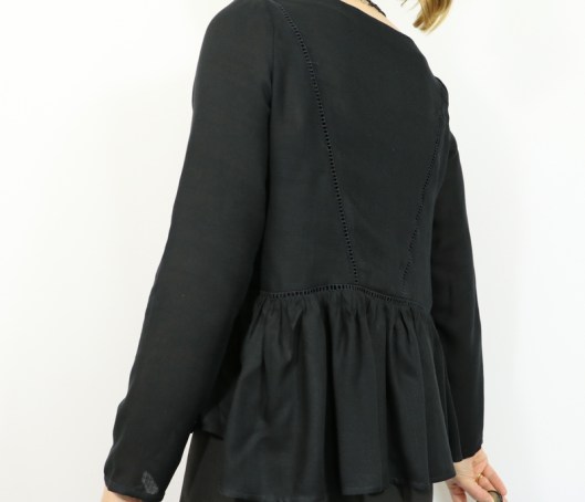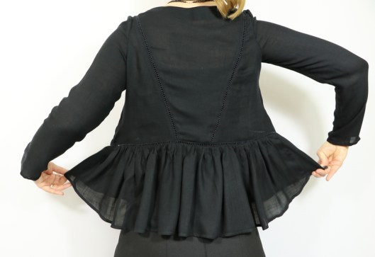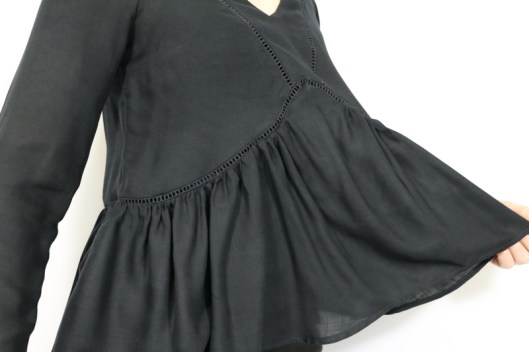 Les basques devant et dos sont très froncées, ça donne beaucoup d’ampleur à la blouse, ce qui ne me plait que moyennement…