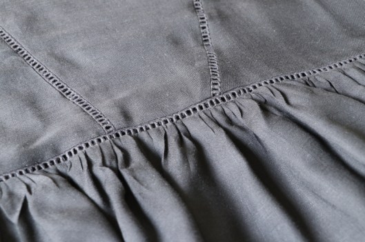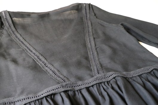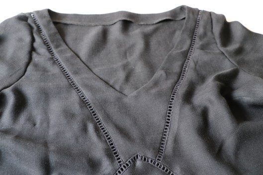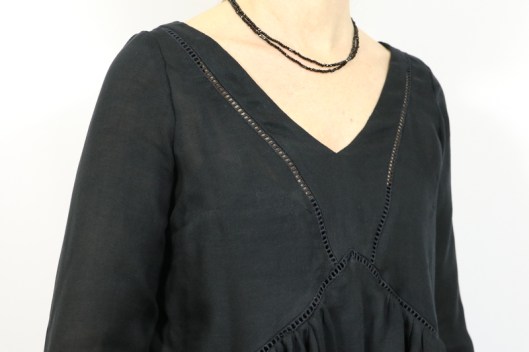Question tissu, la créatrice recommande des « tissus relativement fins et fluides pour ne pas alourdir la blouse, de type viscose, tencel, crèpe, coton léger, voile de coton, Liberty, lainage fin… ». J’ai utilisé ce que j’avais dans mon stock, à savoir une viscose ultra fine que j’avais achetée chez Stop tissus (2€ le mètre). Une misère à couper et à coudre mais c’était en même temps parfait pour ce modèle aux nombreuses fronces !