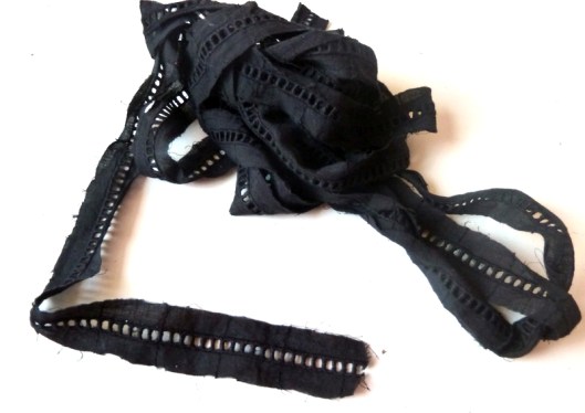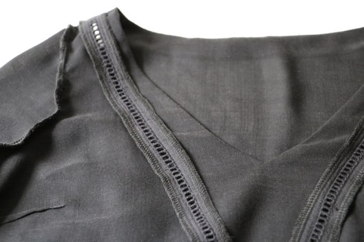 Comme indiqué plus haut, tout le charme et l’originalité de cette blouse repose sur le ruban jour-échelle de 0,5cm de large. La créatrice précise que « cette mesure est celle du jour échelle en lui-même, les bords de couture ne sont pas inclus dans la mesure vu que leur largeur peut varier selon les modèles ». J’ai pour ma part acheté mon ruban chez Fil 2000. Je ne l’ai pas trouvé d’une grande qualité mais vu le prix, je n’ai pas hésité (0,90 le mètre). Le bord est en effet coupé à cru et parfois de façon inégale, il a donc fallu à certains endroits que j’égalise.