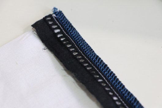 La pose de ce ruban est en fait tout simple. C’est la même chose que pour du passepoil. Il suffit de poser le bord du ruban sur bord du tissu. Ici, mon ruban fait 1 cm donc c’est parfait puisque les valeurs de couture sont de 1cm. On vient ensuite piquer au plus près de la partie ajourée avec un pied pour zip/passepoil. Et pour finir, on vient surjeter les bords. Une fois cette étape couture effectuée, il convient de coucher les valeurs de couture de part et d’autre du ruban et le tour est joué !