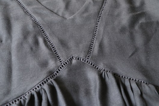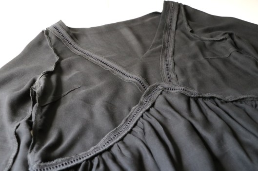Question tissu, la créatrice recommande des « tissus relativement fins et fluides pour ne pas alourdir la blouse, de type viscose, tencel, crèpe, coton léger, voile de coton, Liberty, lainage fin… ». J’ai utilisé ce que j’avais dans mon stock, à savoir une viscose ultra fine que j’avais achetée chez Stop tissus (2€ le mètre). Une misère à couper et à coudre mais c’était en même temps parfait pour ce modèle aux nombreuses fronces !