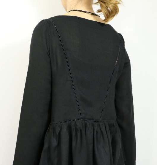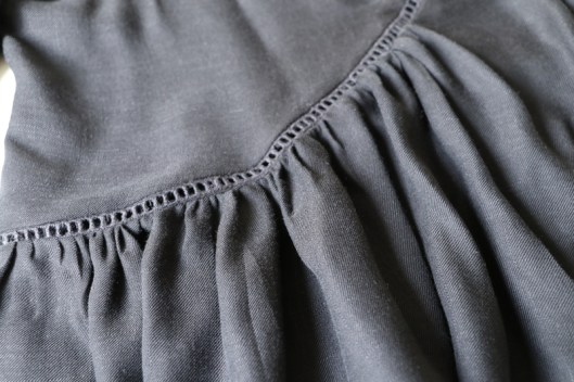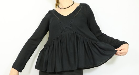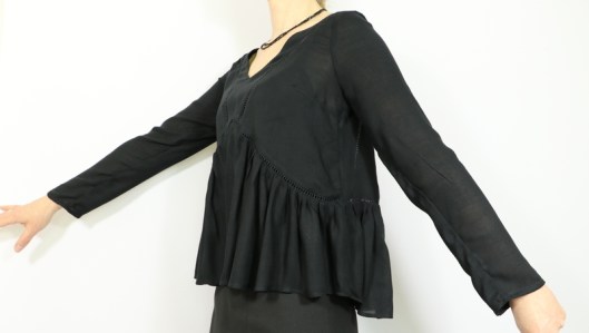 Les basques devant et dos sont très froncées, ça donne beaucoup d’ampleur à la blouse, ce qui ne me plait que moyennement…