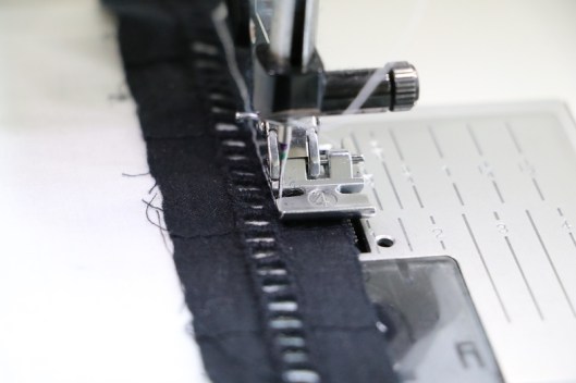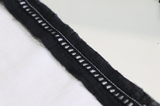 La pose de ce ruban est en fait tout simple. C’est la même chose que pour du passepoil. Il suffit de poser le bord du ruban sur bord du tissu. Ici, mon ruban fait 1 cm donc c’est parfait puisque les valeurs de couture sont de 1cm. On vient ensuite piquer au plus près de la partie ajourée avec un pied pour zip/passepoil. Et pour finir, on vient surjeter les bords. Une fois cette étape couture effectuée, il convient de coucher les valeurs de couture de part et d’autre du ruban et le tour est joué !