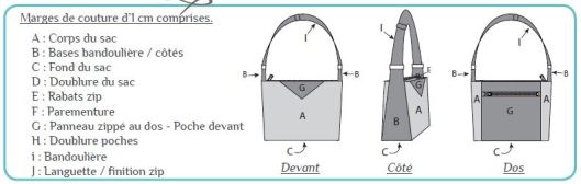 Mon seul petit bémol (s’il doit y en avoir un !) : la bandoulière ne fait pas partie de la planche patron, on doit la dessiner nous-mêmes. Je comprends d’ailleurs tout à fait la démarche de Véro. Voici ce qu’elle m’a répondu : « Pour la bandoulière qui n’est pas à taille réelle, il s’agit d’un choix « écolo-économique » qui vise à économiser encre et papier. Même si je ne mets qu’un demi patron c’est tout de même une bande de 16 x 70 cm qu’il faut caser sur la planche des pièces (en gros 3 pages de plus par taille). Le rectangle en pointillé pour la pièce actuelle peut servir de guide pour tracer, il fait la largeur de la bandoulière (je fais toujours ainsi). »