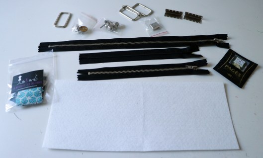A nouveau, la Mercerie des Créateurs a généreusement offert aux testeuses le kit pour coudre ce sac Mambo (proposé en trois tailles). Voici ce que le kit comprend : 1 zip non séparable, 2 zips non séparables, 2 anneaux, 1 boucle coulissante rectangulaire, 1 bouton magnétique, 2 embouts de sangle, 1 embout de zip métallique, 4 pieds de sac et 1 rectangle de molleton rigide. Voici ce que j’ai reçu :