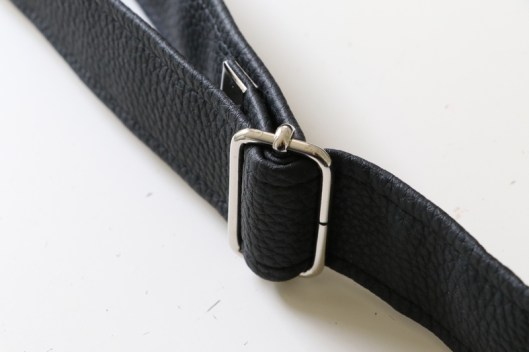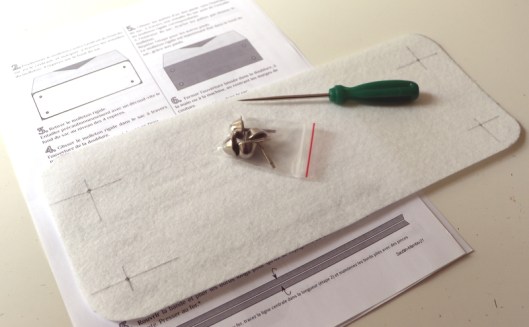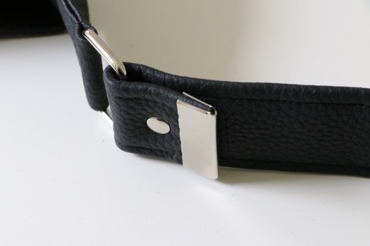 Toujours du fait de l’épaisseur de mon simili, j’ai posé des rivets (de mon stock) et fixé des embouts de sangle (prévus dans le kit). Là aussi, le livret explique comment coudre les extrémités de la bandoulière. On a donc le choix.