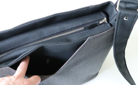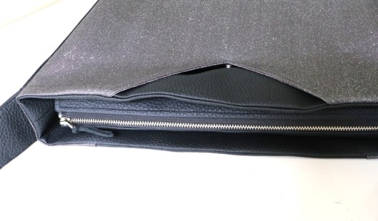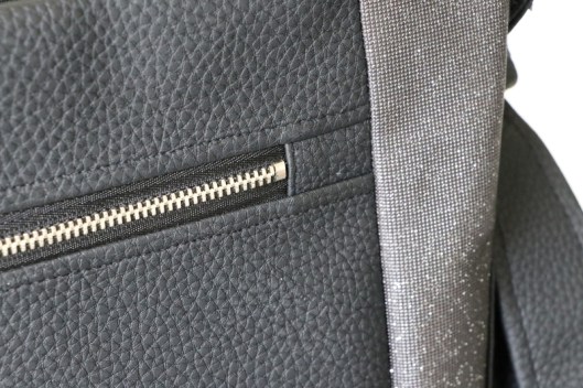 Il n’y qu’une seule surpiqûre que je n’ai pas osé faire du fait de mon simili et de toutes ces épaisseurs (trop peur de tout gâcher) : celle du bord supérieur qui vient fixer l’extérieur et la doublure… C’est en effet l’une des dernières étapes… J’ai donc juste bien presser au fer et ça passe… Si vraiment je vois que ça pose problème, alors je prendrais mon courage à deux mains et ferai cette fameuse surpiqûre finale…