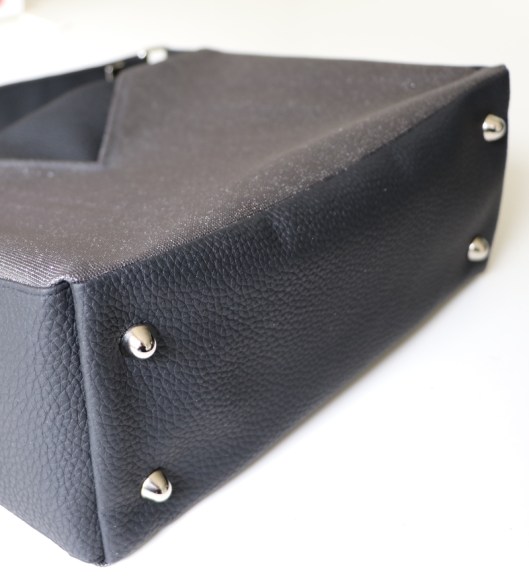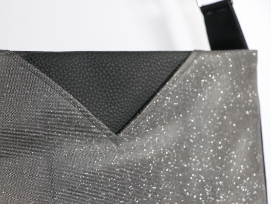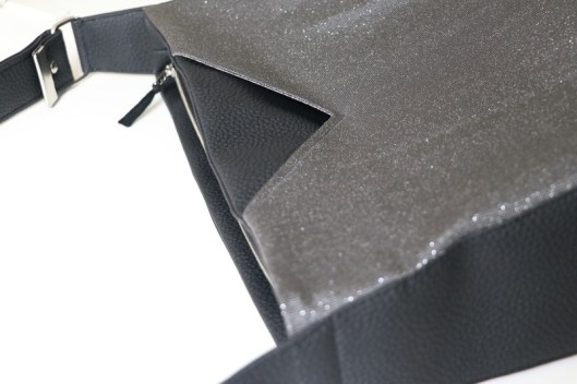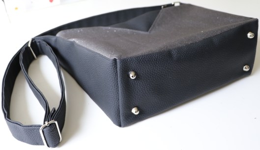 Comme indiqué plus haut, la petite difficulté que j’ai eue a été de surpiquer les côtés du sac, non pas du fait du patron mais du fait de mon simili… D’une manière générale, pour faciliter la couture de l’assemblage de ce simili, j’ai utilisé plusieurs astuces et techniques : utilisation du pied de biche téflon, utilisation du papier de soie, allongement du point droit, j’ai également pressé au fer pour marquer et aplatir la pliure (avec une patte-sèche !) quand cela était nécessaire et puis dernière chose, j’ai utilisé du ruban double-face (type wonder tape) pour certaines étapes…