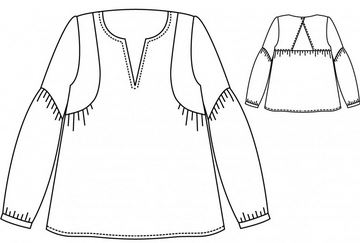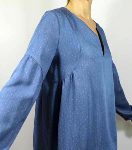 Voici la description de ce patron par Johanna, sa créatrice : « Blouse ou robe au style bohème, dessinée par la talentueuse Fanny alias Petites Choses. Ce modèle, plein de caractère, permet 24 déclinaisons différentes : encolure ouverte en V ou en forme de goutte, joli décolleté V au dos ou dos plein, manches courtes ou longues légèrement bouffantes, robe courte ou très longue… A vous de créer votre style ! »