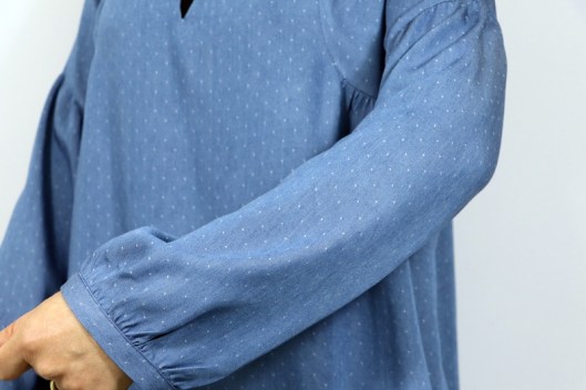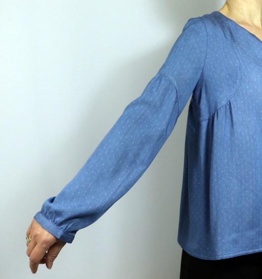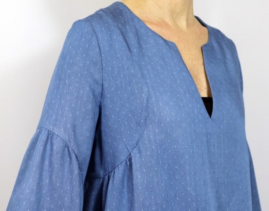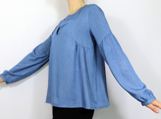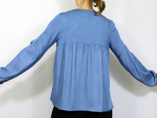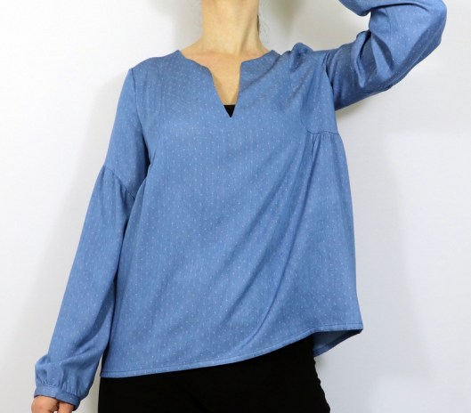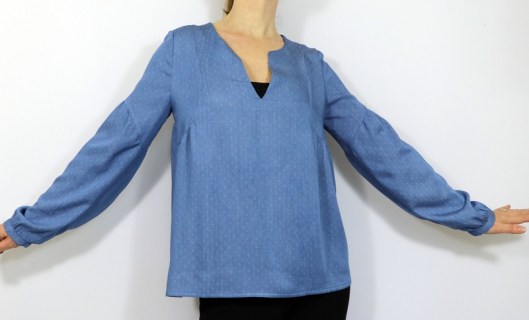 Le niveau annoncé est « intermédiaire ». La notice de montage est claire et suffisamment illustrée. La créatrice propose en plus une vidéo du montage, ce qui peut aider grandement celles et ceux qui redoutent de coudre cette blouse. Voici les points techniques de ce patron : encolure en V / encolure goutte, coutures anglaises, finitions d’encolure au biais, poignets de manche et moi j’ajouterai : gestion des fronces !