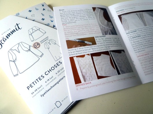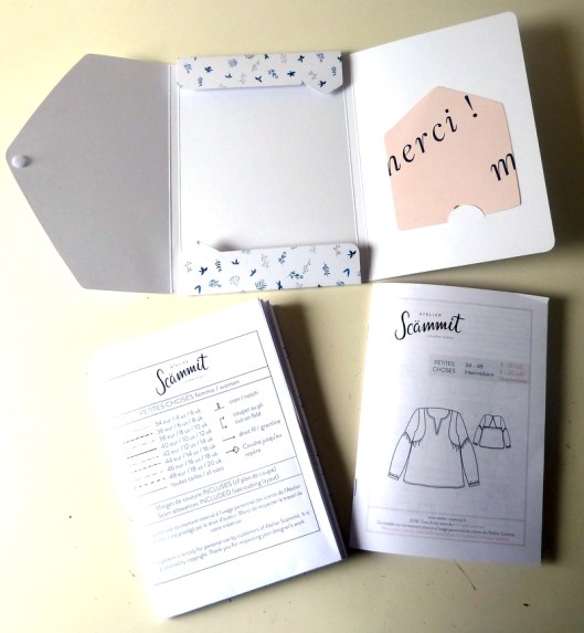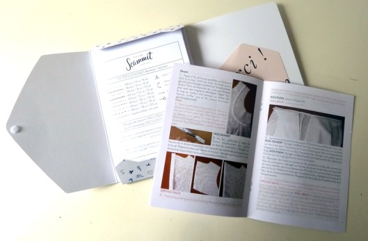 Ce patron est proposé au format pochette (15 €) et au format PDF (9,50 €). A l’occasion du salon de l’Aiguille en fête, j’ai pu bénéficier de la pochette sans avoir à payer les frais de port, ce qui est fort appréciable. Comme pour la blouse Artesane, j’ai trouvé le packaging absolument superbe et la notice de montage est illustrée de photos en couleurs ! Pour info la planche patron contient 10% de superposition.