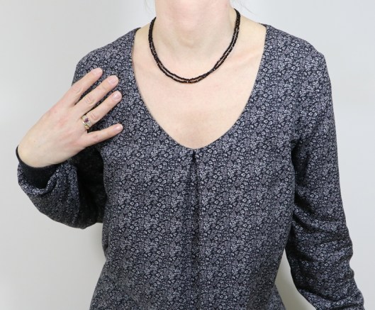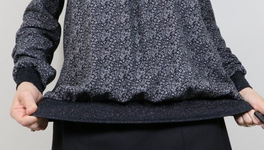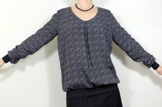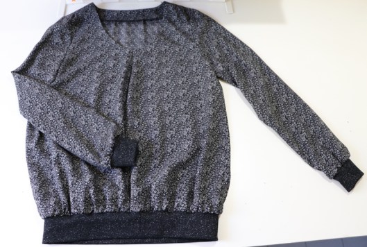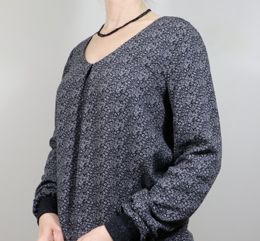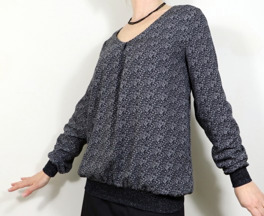 Pour info, je n’ai pas respecté les dimensions indiquées par les pièces du patron puisque mon bord-côte était tubulaire : je n’ai en effet pas voulu le couper pour avoir ensuite une couture d’assemblage à faire… Résultat, ça fait blouser un peu plus que ce que le patron prévoit mais ça me va très bien comme ça.