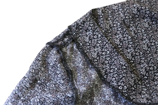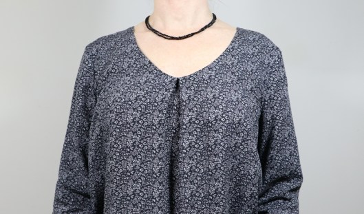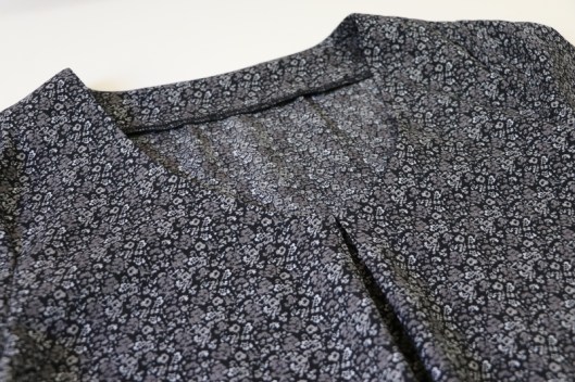 Côté tissus, j’ai opté pour un tissu imprimé indiqué comme étant de la viscose que j’ai achetée chez Toto Tissus/Réaumur (7,99 € le mètre) mais c’est à mon avis une viscose mélangée avec du polyester car la texture et le tombé ne sont pas ceux que je connais habituellement. La marque recommande un tissu chaîne et trame comme une cotonnade fluide, crêpe, voile de coton, lyocell…