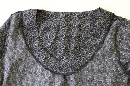 J’assemble ensuite la parementure dos et devant par la couture des épaules puis je surjette les bords extérieurs. Dans le livret, les pièces sont surjetées ou bordées d’un biais de façon séparée… ce que je trouve un peu dommage.