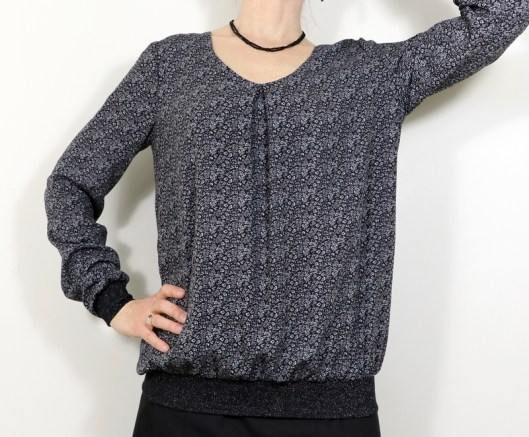 Voici la description de cette blouse par Chez Machine : « Carmen, une blouse ambivalente mais si facile à vivre : aussi urbaine que féminine, aussi élégante que confortable et aussi originale que rapide à coudre. Un décolleté délicat qui saura toutes nous flatter, des jeux de plis devant et dos et une finition bord-côtes. Côté look, « c’est la blouse qui fait du bien au moral », celle qui s’accordera avec tout et que tu ne voudras plus quitter. »