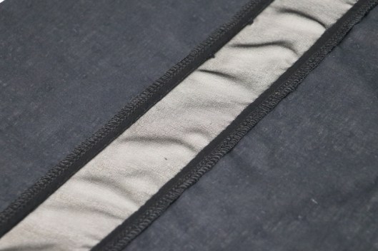 Pour éviter de voir par transparence mes marges de couture, j’ai donc couché les valeurs de couture vers le plumetis que j’ai maintenues ensuite par une surpiqûre.
