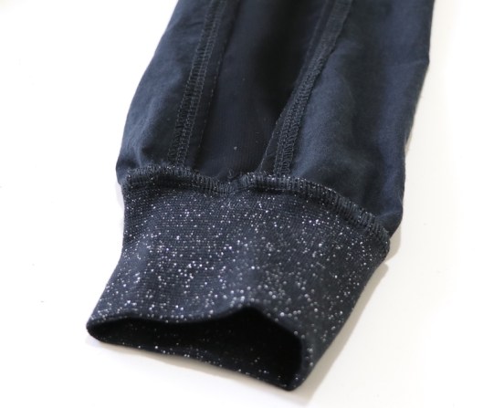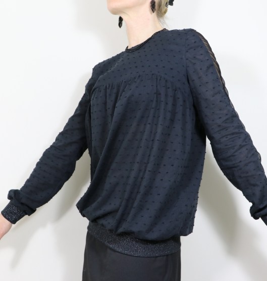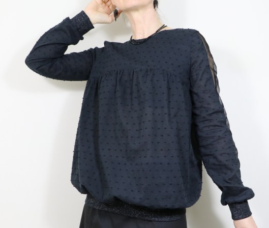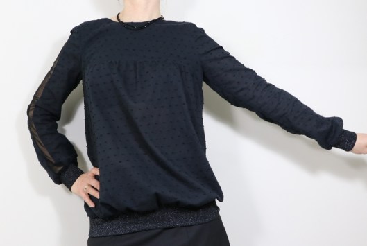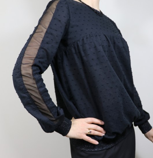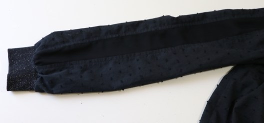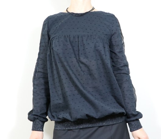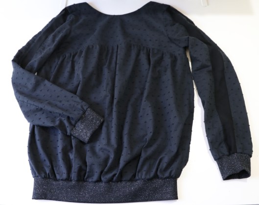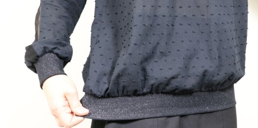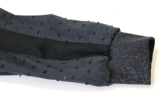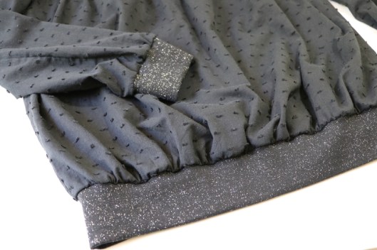 Côté modifications, j’ai donc ajouté du bord-côte au bout des manches et au bas de la blouse. Je venais en effet de coudre la blouse Carmen de Chez Machine… Ceci explique cela ! J’ai choisi un bord-côte tubulaire noir pailleté de 75 cm que j’avais acheté l’année dernière dans la boutique Diffus’laine tissus à Saint-Nazaire : 7€16 les 50cm