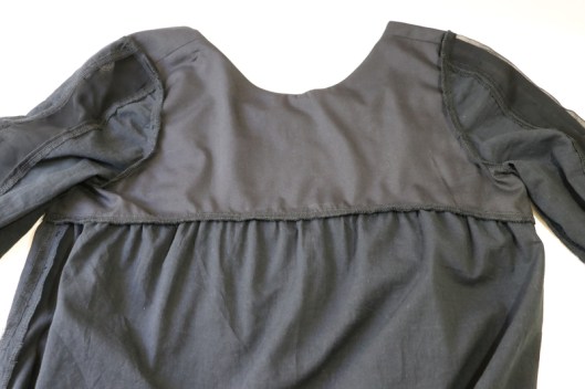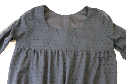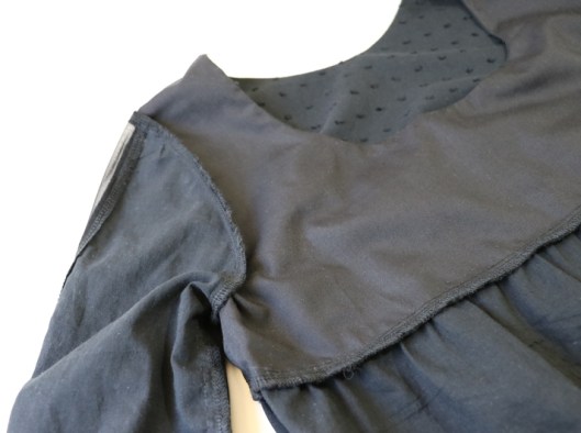 Côté finitions, le livret prévoit de doubler entièrement le haut du corsage devant et dos, ce que j’ai fait. L’encolure est donc bien finie.