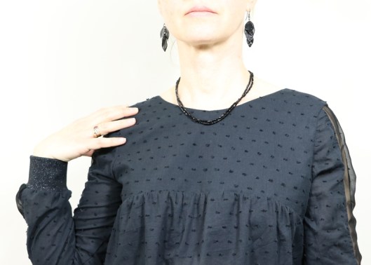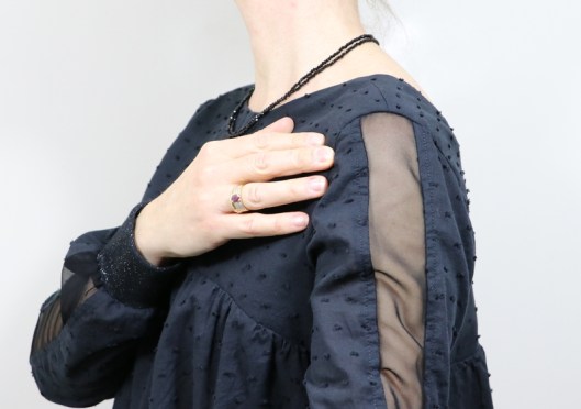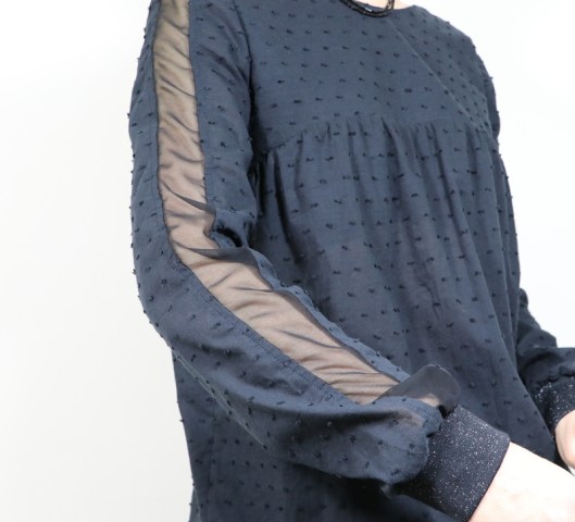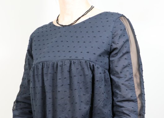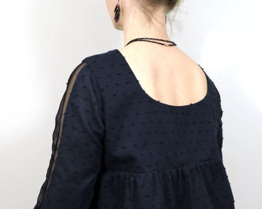 Côté tissu, j’ai voulu jouer sur la matière, la texture, la transparence… Un plumetis de coton noir de chez Les coupons de Saint-Pierre (15€ les 3 mètres) 100% coton selon l’étiquette et un voile de polyester de mon stock pour l’empiècement central de la manche.