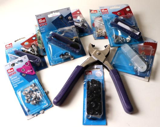 Autre outil qui m’est très utile et dont je suis ravie : ma pince Prym (vario) ! On la trouve dans la plupart des merceries. Celle-ci m’avait été offerte à mes débuts en couture par mes parents. Cette pince permet de poser des pressions (plastique, métal), des œillets et des rivets. Je les achète en général chez Fil 2000 qui propose tout un éventail de pressions/rivets/oeillets différents.