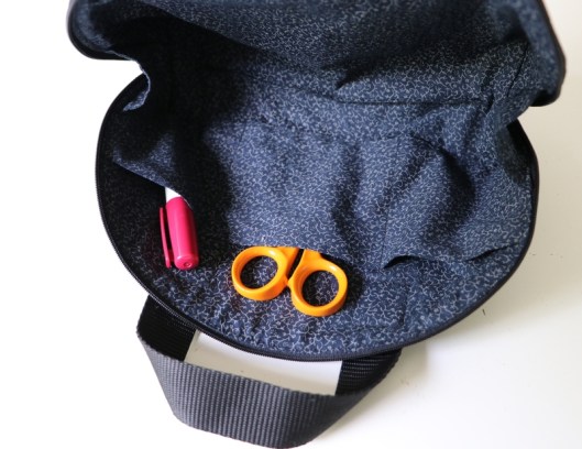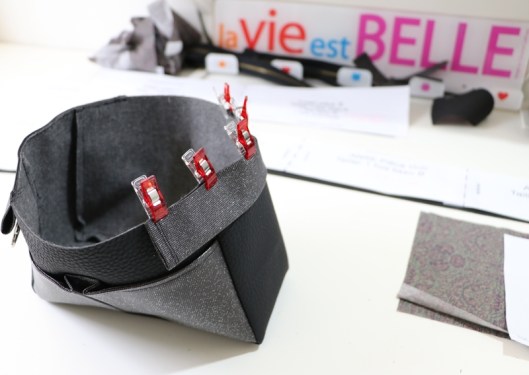 Ci-dessous, le sac est en cours d’assemblage : pose de la coulisse qui permettra d’accueillir plus tard les anses :