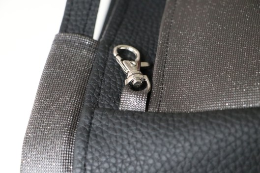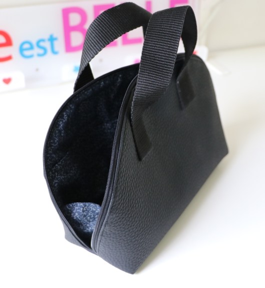 Sur l’intérieur, il y a un poche plaquée compartimentée et 1 poche double zippée de l’autre. J’ai bien aimé la façon d’assembler ces poches, j’ai trouvé ça assez astucieux !