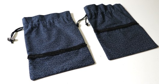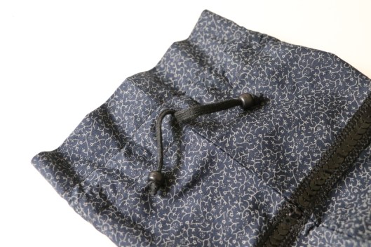 Dans la foulée, j’ai cousu deux pochettes avec lien à nouer dont le tuto est proposé gracieusement par Etoffe malicieuse. Il s’agit à la base de petit pochon de lingerie mais on peut y mettre évidemment ce que l’on y souhaite ! C’est tout simple à réaliser mais ça demande tout de même minutie et précision notamment pour la formation de la coulisse.