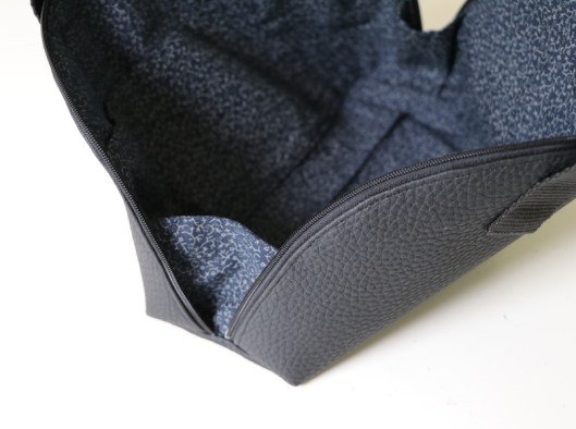 Le patron propose d’entoiler et de molletonner (matelassage + quilting) cette trousse, ce que je n’ai pas fait : mon simili cuir étant là aussi suffisamment rigide.