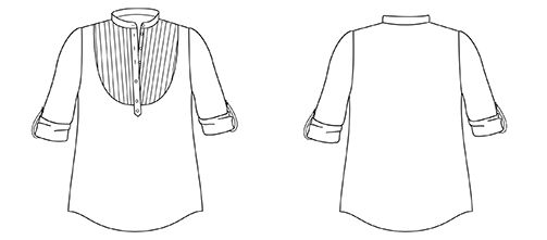 Elle possède un col mao, un empiècement à plis plats, une parementure à boutons et des longues manches froncées délicatement aux poignets.