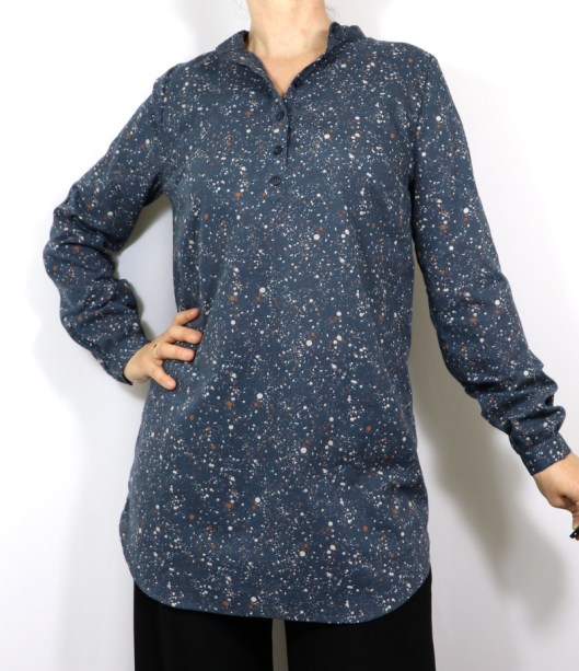 En ce qui concerne la taille, le patron est proposé de la taille 34 à 44. J’ai à nouveau choisi de coudre la blouse en taille 38, c’est donc une taille au-dessus de la mienne d’après le tableau des tailles (tour de poitrine). C’est donc un peu plus large, mais cette aisance me plait ainsi. J’ai en revanche allongé ma tunique de 11 cm pour qu’elle soit un peu plus longue (pour ce faire, j’ai juste prolongé les lignes latérales contrairement à ma précédente version où j’avais un peu élargi les côtés).