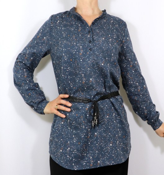 En ce qui concerne la taille, le patron est proposé de la taille 34 à 44. J’ai à nouveau choisi de coudre la blouse en taille 38, c’est donc une taille au-dessus de la mienne d’après le tableau des tailles (tour de poitrine). C’est donc un peu plus large, mais cette aisance me plait ainsi. J’ai en revanche allongé ma tunique de 11 cm pour qu’elle soit un peu plus longue (pour ce faire, j’ai juste prolongé les lignes latérales contrairement à ma précédente version où j’avais un peu élargi les côtés).