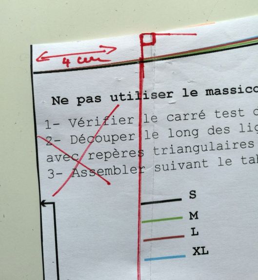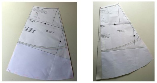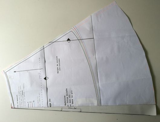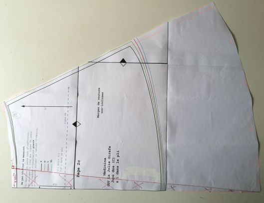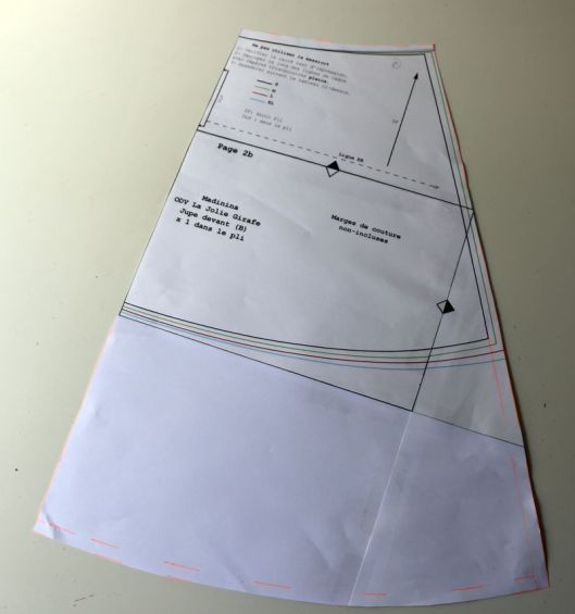 Pour la jupe, j’ai coupé le patron intégralement en taille S car mais hanches y passaient sans problème. J’ai par contre allongé la jupe de 21 cm pour avoir une jupe de la longueur souhaitée, c’est à dire juste au dessus des genoux. Pour ce faire, j’ai tout simplement prolonger les lignes (je n’ai pas utilisé la ligne agrandir/raccourcir prévue dans le patronage) :