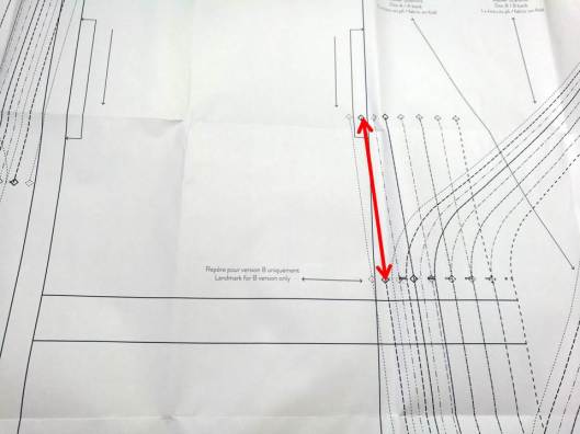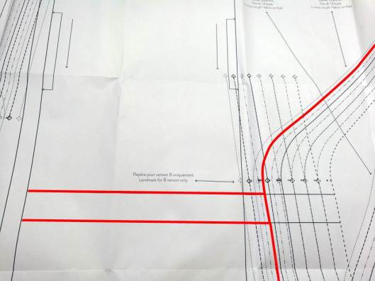 3/ je n’avais pas compris au premier abord que l’emplacement de la surpiqûre était différente pour la version B. Les deux versions de manches (A et B) se superposant, je n’avais au préalable pas compris que la surpiqûre devait s’arrêter au niveau du second cran. La flèche rouge indique donc la piqûre à effectuer pour la version B.