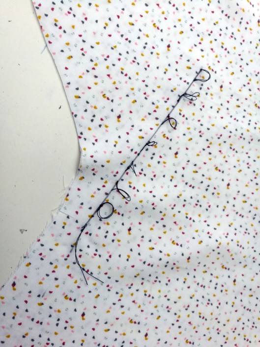 Cette surpiqûre se fait une fois la robe finie : il convient de superposer minutieusement le devant & le dos du corsage, de tout bien épingler et de coudre cette fameuse ligne. C’est une technique qu’on a peu l’habitude de voir.