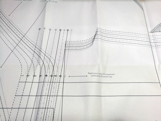 J’ai suivi les conseils d’atelier Scammitt pour reporter les lignes et repères du patron en utilisant du papier carbone (j’espère juste que ça partira bien ensuite au lavage !) :