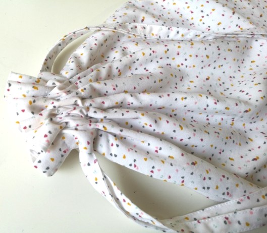 Pour ma prochaine version, je compte réduire la longueur de cette coulisse, histoire qu’elle vienne se positionner à 2 cm du bord. Elle ne sera ainsi pas prise dans la couture d’assemblage des côtés.