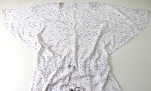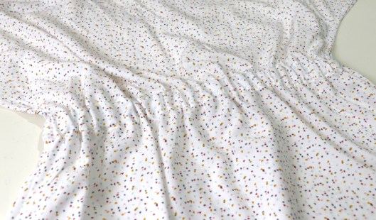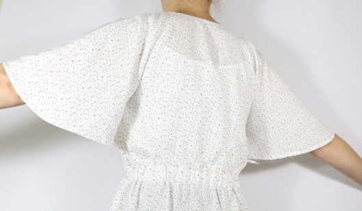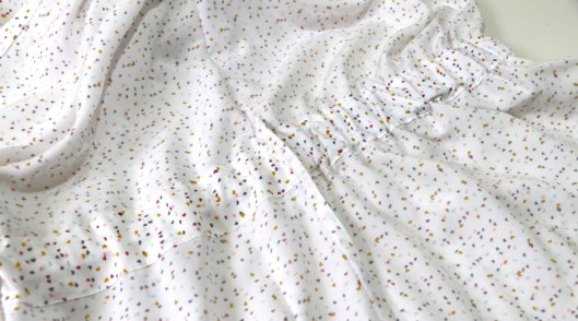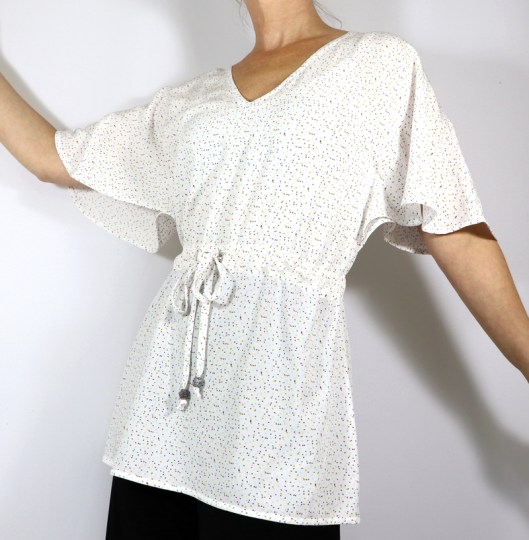 Côté tissus, la créatrice conseille des tissus à poids très léger à léger & très fluide de type batiste, crêpe, denim léger, viscose… métrage nécessaire : de 1m90 (version courte) à 3m (version longue). J’ai opté pour de la viscose que j’ai achetée chez Tissus Reine (10,90€/m). Comme je n’avais qu’1m50 de ce tissu, j’ai été contrainte de raccourcir la robe de 15 cm. Résultat, j’ai une tunique !